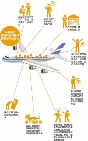 征求意见稿明确了14种危及民用航空安全和秩序的非法干扰行为,除了在航空器内禁止使用手机、吸烟、抢占座位、值机柜台外,还包括劫持飞行中或者地面上的航空器;在航空器上或机场扣留人质;强行闯入航空器、机场或者航空设施场所,冲闯航空器驾驶舱,强行拦截航空器;非法将武器、危险装置或者材料带入航空器、机场或者空中交通管制单位;谎报险情、制造混乱、散布诸如危害飞行中或地面上的航空器、机场或民航设施场所内的旅客、机组、地面人员或者公众安全的虚假信息;盗窃、故意损坏、擅自移动航空器设备以及机场内其他航空设施设备,强行打开飞行中航空器应急舱门等。